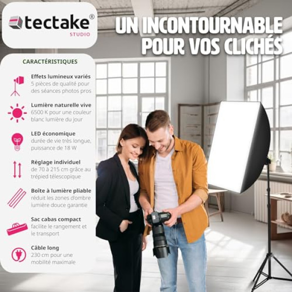 Transformez votre espace en véritable studio professionnel avec ce kit d'éclairage Softbox TecTake. Conçu pour les créateurs de contenu exigeants, ce système offre une qualité d'éclairage exceptionnelle qui sublimera tous vos projets photo et vidéo. ✨